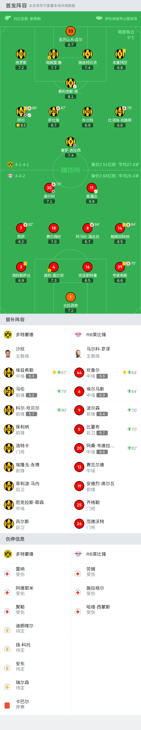 在德国足球顶级联赛第9轮的比赛中,多特蒙德坐镇主场迎战RB莱比锡。比赛中,RB莱比锡的奥蓬达在第27分钟为谢什科创造了得分机会,谢什科成功将球送入网内,让RB莱比锡取得领先。随后,多特蒙德的费利克斯-恩梅加在第30分钟为拜尔送出助攻,拜尔不负众望,将比分扳平。比赛进入下半场,多特蒙德再次反超比分,拜尔传中助攻,吉拉西头槌破门,帮助球队以2-1战胜对手。